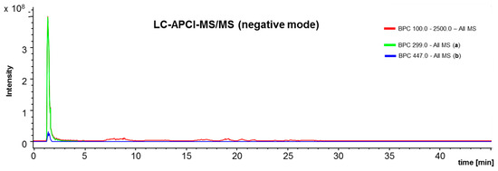 Representative liquid chromatography-atmospheric pressure chemical ionization ion-trap mass spectrometry (LC-APCI-IT-MS/MS) (negative mode) chromatogram of green propolis supercritical extract (GPSE). Scanning range was from m/z 100 to m/z 2500; ionization voltage, +900 V; end plate offset, −500 V, Trap Drive, 79.2; Octopole RF Amplitudein Volt; 187.1 Vpp; lens 2, 60 V; Cap Exit −115 V; Smart ion charge control (ICC) target, 70,000. (a): artepillin C, retention time (Rt) 1.5 min: [M-H]− m/z 299, MS/MS: 255, 200. (b): (E)-3-(4-hydroxy-3-[(E)-4-(2,3-dihydro-cinnamoyl-oxy)-3-methyl-2-butenyl]-5-prenyl-phenyl)-2-propenoic acid, Rt 1.5 min: [M-H]− m/z 447, MS/MS: 297, 253, 198, 149 [42].