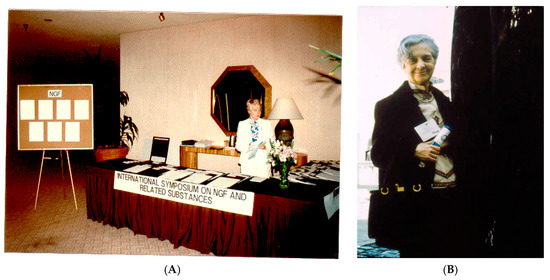 (A) Registration desk in Monterey for the 1st NGF conference held in 1986; and (B) Honoree, Rita Levi-Montalcini.