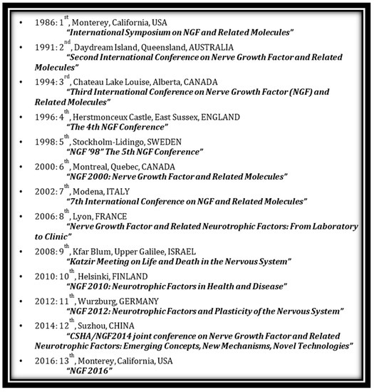 The International NGF Meeting series has many unique features setting it apart from most scientific meetings (Figure 6). It did not start as a series and has little or no continuous leadership. With the exception of the 2004 meeting that ultimately was not held, there has been continued support, indeed enthusiasm, for the series. Considering it is not associated with any established organization or learned society, its overall stability and staying power is even more remarkable. The latest meeting (Figure 7), envisioned as a 30-year anniversary of the first meeting, continued the tradition and allowed some reflection on where the field has gone over the period between the two meetings [48]. The field has advanced enormously and continues to do so. Collectively and individually, the neurotrophic factor family, headed by the patriarch, NGF, has become central for revealing basic principles of cell and neurobiology and its relevance to disease—particularly those with their origins in the CNS, which are among the most devastating and intractable to manage and treat. There can be little doubt about the important role they have in these disorders and the potential they offer to provide routes to therapy.