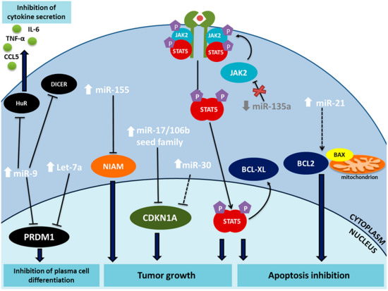 Gibcus et al. compared the expression of 183 miRNAs in HL cell lines (L428, L1236, KM-H2, DEV) with other B cell lymphoma cell lines and described a 23-miRNA signature characteristic of HL cell lines. The signature included key overexpressed miRNAs (miR-17-92 cluster, miR-16, miR-21, miR-24, miR-155) and a downregulated miRNA (miR-150) [26] (Figure 1).