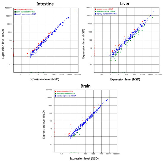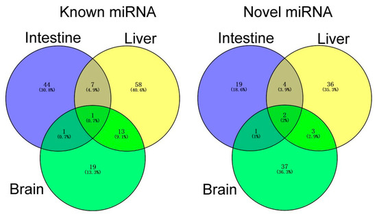 After removing the sequencing tags fewer than five reads, a total of 79, 124 and 77 miRNAs were identified as DEMs in intestines, livers, and brains between NSD and HSD groups (Figure 2), following the criteria of|log2FC(Fold change)| ≥ 1 and p-value ≤ 0.05. Among them, there were 53, 79 and 34 conserved known miRNAs, respectively, plus with 26, 45 and 43 novel miRNAs (Supplementary Table S6). There were 7, 79 and 47 upregulated miRNAs and 72, 45 and 30 downregulated miRNAs in intestines, livers, and brains in the HSD group, in comparison with NSD (Supplementary Table S6). Among those DEMs, only one known DEM (mam-miR-205-5p) and two novel DEMs (mam-miR-n28, and mam-miR-n121) were the common DEM among three organs (Figure 3, other common DEMs, see Supplementary Table S6). However, mam-miR-205-5p was significantly upregulated in HSD intestines, whereas it was significantly downregulated in HSD livers and brains, in comparison with corresponding organs in NSD groups (Supplementary Table S6).