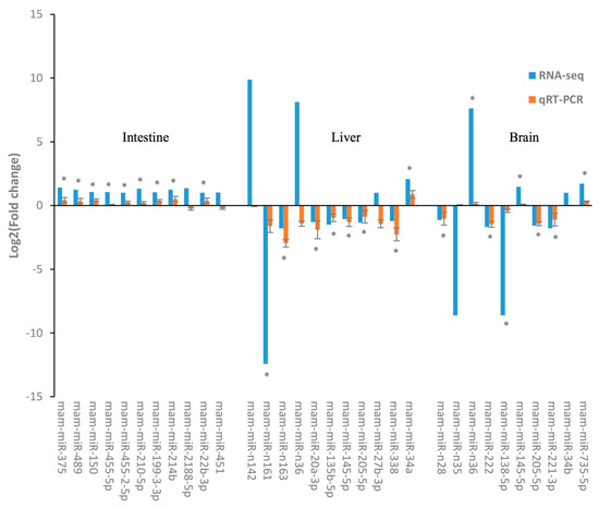 Using the clustering analysis, we obtained the expression profiles of these DEMs in samples (Supplementary Figure S7). Using the qRT-PCR, we detected the expression patterns of 32 DEMs randomly selected from the above DEMs and confirmed the high accordance of qRT-PCR results with that of RNA-Seq analysis. These DEMs might be tightly related to the glucose or lipid metabolism in response to HSD treatment. Intriguingly, for all seven of the differential expressed novel DEMs identified by small RNA sequencing analysis, obvious higher log2 (Fold change) values were detected using qRT-PCR in comparison with RNA-seq (Figure 4). Additionally, most of these novel miRNAs in M. amblycephala tissues showed more significant differences in relative expression levels by qRT-PCR than those of the conserved miRNAs, such as mam-miR-n142, mam-miR-n161, mam-miR-n35, and mam-miR-n36. Expression patterns of 9 out of 11, 8 out of 11, and 8 out of 10 DEMs, respectively, in intestines, livers, and brains were consistent with the result of RNA-Seq analysis (Figure 4, and the corresponding Supplementary Table S7). We demonstrate that the sequencing data and the qRT-PCR results in this present study are in accordance, and the analyses for DEMs are significative.