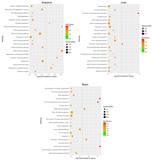 Next, we annotated the biofunction or biochemical signal pathways related to those predicated miRNA targets by subjecting those target unique genes to Gene Ontology database: (available online: http://www.geneontology.org/) and the Kyoto Encyclopedia of Genes and Genomes (KEGG) pathway database (http://www.kegg.jp/). Based on the Gene Ontology (GO) functional annotation, we found these predicted target genes in intestines, livers, and brains were classified into classes of molecular functions, cellular components and biological processes over decades(p < 0.05), such as gluconeogenesis (GO:0006094), hexose biosynthetic process (GO:0019319), monosaccharide biosynthetic process (GO:0046364), regulation of macromolecule metabolic process (GO:0060255), glucose metabolic process (GO:0006006),response to carbohydrates (GO:0009743), phosphoenolpyruvate carboxykinase activity (GO:0004611) and carboxy-lyase activity (GO:0016831, Supplementary Table S9). For instance, predicted DEM targets such as glycerol-3-phosphate dehydrogenase 2 (GPD2), phosphoglucomutase 1 (PGM1), and phosphoenolpyruvate carboxykinase 1 (PCK1) enriches into GO terms including gluconeogenesis and the glucose metabolic process.