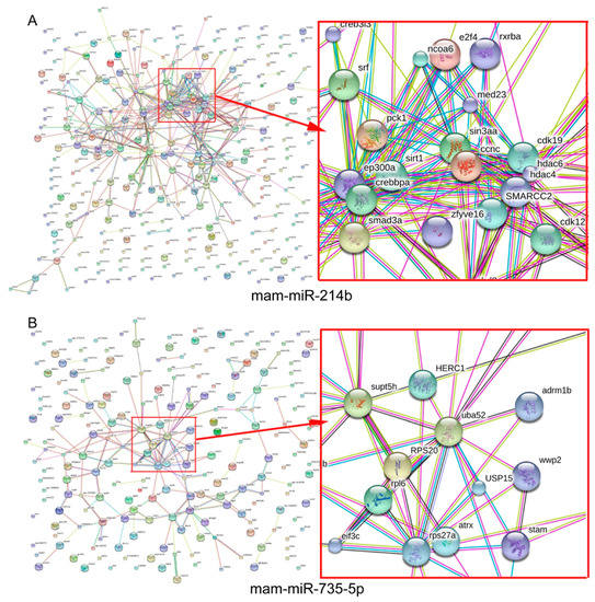 Interaction analyses of gene products do better at understanding interactions between DEM targets. To explore the interaction between predicted targets, the PPI networks of several DEM targets were predicted using a Search Tool for the Retrieval of Interacting Genes/Proteins (STRING) database. We constructed several PPIs including two generated from interactions between mam-miR-735-5p and mam-miR-214b predicated targets, respectively (Figure 6, more PPIs of four DEMs are available in Supplementary Figure S8). In PPI networks, we observe that the target genes interact with each other (Figure 6, lines between nodes indicates interactions). For example, PCK1 interacts with other predicated targets of mam-miR-214b, including SRT1, CDK19, Sin3aa, EP300A, SMARCC2 and SMAD3a.