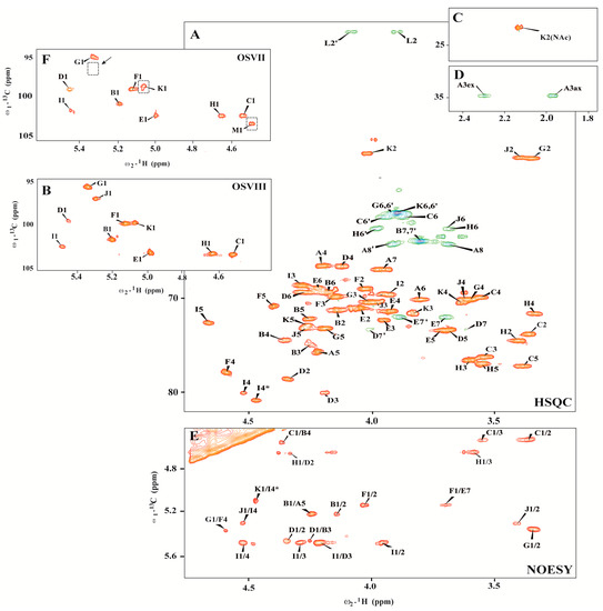 The 1H NMR (nuclear magnetic resonance) spectrum of the OSVIII contained main signals for nine anomeric protons, and signals characteristic for the deoxy protons of Kdop residue belongs to part of the core oligosaccharide (residues A–J). The HSQC-DEPT (heteronuclear single-quantum correlation-distortionless enhancement by polarization transfer) spectra obtained for the OSVIII fraction contained signals for nine major anomeric protons and carbons, and Kdo spin systems, respectively (Figure 1 and Table 1).