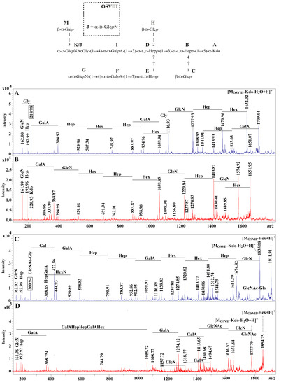 The OSVIII and OSVII fractions were analyzed by ES MSn and MALDI-TOF MS/MS. Ten sugar residues: two Glc, three Hep, two GalA, two GlcN, and Kdo, give together a monoisotopic mass of 1812.567 Da (MOSVIII). Eleven sugar residues from OSVII give together a monosotopic mass of 2016.630 Da. The negative ESI MSn (Figure 2A) mass spectrum of OSVIII showed the main ion at m/z 905.2 [MOSVIII-2H]2− correspond to core oligosaccharide (OSVIII), and ions correspond to core substituted with the glycine (Gly) residue at m/z 933.7 [MOSVIII+Gly-2H]2− and m/z 924.7 [MOSVIII+Gly-H2O-2H]2−. The negative ESI MSn mass spectrum of OSVII showed the main ion at m/z 1035.8 [MOSVII+Gly-2H]2−, which represented the complete core oligosaccharide substituted by Gly (Figure 2B).
