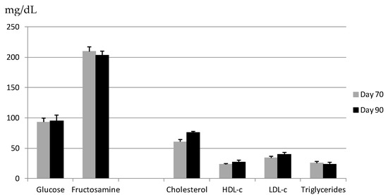 Metabolic profiles of sows, from which foetuses were harvested on Gestational Day (GD) 70 or 90. Mean fasting values (mg/dL) (±SEM) of glucose, fructosamine, total cholesterol, high-density and low-density lipoprotein-cholesterol (HDL-c and LDL-c, respectively) and triglycerides in maternal plasma on the day of harvest.