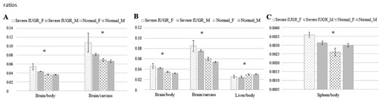 Influence of foetal sex on foetal development under conditions of normal growth or severe IUGR: mean ratios (± mean square error) of brain-to-body weight and brain-to-carcass weight on Gestational Day (GD) 70 (A); ratios of brain-to-body weight, brain-to-carcass weight and liver-to-body weight on GD 90 (B); and ratio of spleen-to-body weight on GD 90 (C). Bars indicate, from left to right, female and male foetuses with severe IUGR, then female and male foetuses showing normal growth. Asterisks indicate the p value associated with differences between the foetal sexes and between foetuses showing IUGR or normal growth. * p < 0.05.