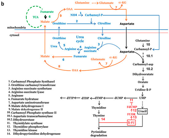 - Rabinovich, S.; Adler, L.; Yizhak, K.; Sarver, A.; Silberman, A.; Agron, S.; Stettner, N.; Sun, Q.; Brandis, A.; Helbling, D.; et al. Diversion of aspartate in ASS1-deficient tumours fosters de novo pyrimidine synthesis. Nature 2015, 527, 379–383. [Google Scholar] [CrossRef] [PubMed]