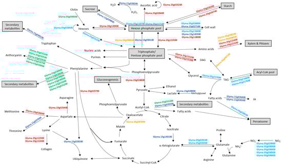 Overview of metabolic processes involved by positional and functional candidate genes. Candidate genes names from Glyma.Wm82.a2.v1 (Gmax2.0) (available online: http://soybase.org) are shown in bold and color-coded by chromosomes.