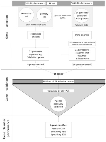 - Pfeifer, A.; Wojtas, B.; Oczko-Wojciechowska, M.; Kukulska, A.; Czarniecka, A.; Eszlinger, M.; Musholt, T.; Stokowy, T.; Swierniak, M.; Stobiecka, E.; et al. Molecular differential diagnosis of follicular thyroid carcinoma and adenoma based on gene expression profiling by using formalin-fixed paraffin-embedded tissues. BMC Med. Genom. 2013, 6, 38. [Google Scholar] [CrossRef] [PubMed]
