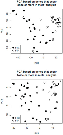 To visually inspect whether the genes selected in the meta-analysis are able to separate FTC and FTA on an independent dataset, Principal Component Analysis (PCA) was conducted. We performed PCA on our own microarray samples, based on genes that occurred at least once in the meta-analysis (Figure 2 upper plot). We also performed PCA on these samples, based on the genes that occurred at least twice in the meta-analysis (Figure 2 lower plot).