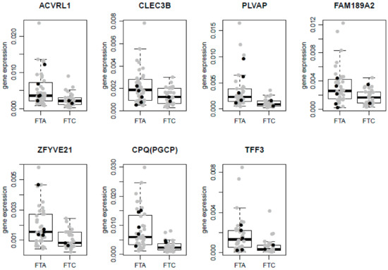 The analysis of genes differentially expressed in FTC and FTA in our own gene expression microarray dataset revealed 56 genes. Genes with higher fold-changes and lower p values (Table S4), as well as those related to other types of cancer or tumour aggressiveness were preferably selected for qRT-PCR validation. One of these genes, ACVRL1 correlated with tumour progression in patients with head and neck cancers [31]; whereas two other genes: ZFYVE21, and CLEC3B were related to cancer invasiveness [32,33]. Four genes, obtained from the meta-analysis were subsequently positively validated CPQ, PLVAP, TFF3, and FAM189A2.
