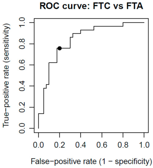 The ROC curve was also created to assess the diagnostic efficacy of the classifier (Figure 4). In the outer leave-one-out loop, for each sample, the probability that the sample belongs to the FTC class was calculated, based on DLDA algorithm. Varying the threshold for the probability, the ROC curve was plotted.