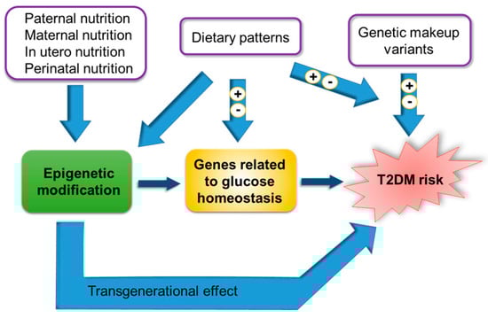 As previously mentioned, T2DM occurs as a consequence of the interaction between genetic and environmental factors. One of the most important environmental factors to consider is diet. GWAS have identified about 100 loci that influence the risk of developing T2DM. Most of them are responsible for alterations in the development of pancreatic islets and/or their function and only a few act through insulin signalling [240]. However, these variants have a reduced effect on the risk of T2DM and are only able to explain at most 10–15% of T2DM inheritance [4]. Thus, if T2DM is a disease in which the hereditary component is important and the genetic variants can explain only a minimal part of that inheritance, this means epigenetic modifications could explain the relationship between environmental factors and the risk of developing T2DM. The proposed explanation is that epigenetic changes occurring throughout life caused by environmental factors (such as diet) can modify gene expression and affect susceptibility to T2DM. In this regard, one of the major changes that has occurred in the Western world and that undoubtedly contributes to the increase in the prevalence of T2DM is an increased caloric intake and reduced energy expenditure, the latter caused by a sedentary lifestyle.