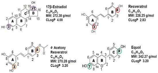 Comparison of the chemical structures, molecular formulas, molecular weights and CLogP values among 17β-estradiol, resveratrol, 4′ acetoxy resveratrol and equol. CLogP = the logP value of a compound representing its partition coefficient and lipophilicity. The purple circles at carbon 3 and 17 for 17β-estradiol represent the functional positions; the red and brown circles at carbon 3 and 4′ represent the functional positions for resveratrol and 4′ acetoxy resveratrol, respectively, and the green circles at carbon 7 and 4′ represent the functional positions for equol.