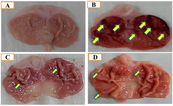 Gastroprotective activity of Aronia melanocarpa hydro-alcoholic extract (AMHAE) (200 mg/kg) on ethanol-induced gastric injury in rats. (A) Normal rats; (B) Ulcer control; (C) Omeprazole (30 mg/kg) pretreated rats; (D) AMHAE (200 mg/kg) pretreated rats. Ethanol-induced severe injuries to the gastric mucosa appear as elongated bands of hemorrhage (yellow arrows).