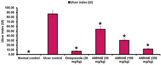 Effect of AMHAE (50, 100, and 200 mg/kg, orally) on the ethanol-induced ulcer index in rats. Values are mean ± S.D. (n = 6). * p < 0.05, comparing the ulcer control with all of the groups.