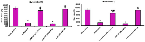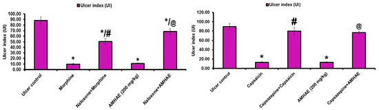 Pre-synaptic α2-receptors facilitate various reactions in the digestive tract, and they participate in the regulation of acid secretion in the gastrointestinal tract [18]. Pretreatment with yohimbine (α2-receptors antagonist) did not block the gastroprotective effect of AMHAE against ethanol-induced gastric damage. In the same way, pretreatment of glibenclamide (inhibitor for ATP-sensitive potassium channel (K+ATP channel)) failed to block the protective effect of AMHAE against ethanol-induced gastric damage. Since yohimbine and glibenclamide were quiet in eliminating the AMHAE-delivered gastroprotection, we conclude that mechanisms excluding α2-receptors and the K+ATP channels contribute to its protective activity. l-NAME (non-selective inhibitor of nitric oxide synthase) efficiently blocked the gastroprotection caused by AMHAE, proposing NO contribution in its gastroprotection. It is well-identified that NO is a contributor in the inflection of gastric mucosal integrity, gastric mucosal blood flow, and mucus secretion [4,19]. In order to validate the starring role of prostaglandins in the gastroprotection provided by AMHAE, animals were pretreated with indomethacin (non-selective cyclooxygenase inhibitor). The outcomes exposed that the gastroprotection made by AMHAE against ethanol-induced gastric wounding was significantly alleviated by indomethacin, signifying a major part of endogenous prostaglandins in its gastroprotection. Treatment with capsazepine (vanilloid receptor antagonist) reduced the gastroprotective activity of AMHAE or capsaicin, indicating the possible contribution of primary afferent receptors sensitive to capsaicin. Vanilloids facilitate the production of NO through eNOS activation present in afferent neurons, contributing further to the gastroprotective effect [20]. Opioids and opiates considerably affect a range of digestive functions, including motility, secretion, and fluid transport by means of the stimulation of the opioid receptors [21]. The current experimental results displayed a reversal of the gastroprotective effect of AMHAE by the treatment of naloxone. This outcome highlights the association of opioid receptors in the protective mechanism of AMHAE [22].