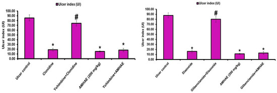 The effect of pretreatment with yohimbine and glibenclamide in gastroprotection provided by AMHAE. Values are mean ± S.D. (n = 6). * p < 0.05, comparing the ulcer control with all of the groups; # p < 0.05, comparing clonidine with yohimbine + clonidine or diazoxide with glibenclamide + diazoxide.