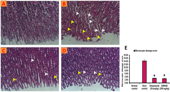 AMHAE (200 mg/kg) alleviates ethanol-induced gastric histological alterations in rats. (A) Normal; (B) ulcer control; (C) omeprazole (30 mg/kg); (D) AMHAE (200 mg/kg); and (E) microscopic damage score level of different groups. Original magnification 20×. * p < 0.05 compared ulcer control with all of the groups. Note: inflammatory cell invasion (white arrows) and Oedema formation (yellow arrows).