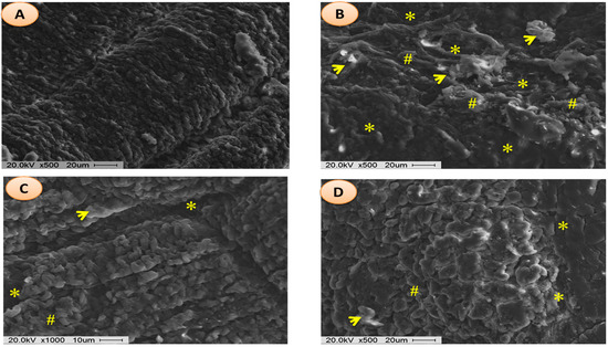 Scanning electron micrograph images of gastric injuries. Experimental groups: (A) normal; (B) ulcer control; (C) omeprazole (30 mg/kg); and (D) AMHAE (200 mg/kg). Note: epithelial desquamation (yellow asterisk); fibrin deposits and hemorrhage with erythrocytes (yellow arrows); and gastric epithelium with slightly widened gastric pits (pound signs).