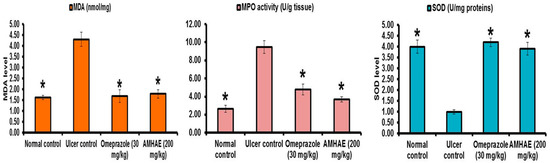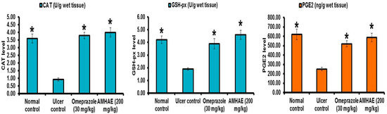 Scanning electron micrographs of rat fundic mucosa of various animal groups were depicted in Figure 7. Normal control group exhibited closely packed with gastric glands, the luminal surface of gastric epithelial cells and underlying muscularis mucosa (Figure 7A). Ethanol-induced ulcer control group showed the disturbed architecture of gastric mucosa, loss of surface epithelial cells with coverage of underlying lamina propria, and necrotic debris (Figure 7B). In the omeprazole and AMHAE pretreated group, scanning electron micrographs point out a nearly normal topography of gastric epithelium with marginally widened gastric pits and slight injury with small deposits of fibrin (Figure 7C,D). Malondialdehyde (MDA) and myeloperoxidase (MPO) levels were significantly (p < 0.05) elevated (2.63- and 3.59-fold, respectively) and the prostaglandin E2 (PGE2) level was decreased (2.47-fold) in the ethanol-induced ulcer control group. In opposition, treatment of AMHAE (200 mg/kg) showed a significant (p < 0.05) decline in MDA and MPO levels by 2.40- and 2.56-fold, respectively, and increased PGE2 level by 2.34-fold (Figure 8). Superoxide dismutase (SOD), catalase (CAT), and glutathione peroxidase (GSH-px) levels were significantly declined (4.0-, 3.90-, and 2.21-fold, respectively) in the ethanol-induced ulcer control group compared to the normal group. However, AMHAE (200 mg/kg) pretreated animals displayed a significant rise in SOD (3.90-fold), CAT (4.33-fold), and GSH-px (2.42-fold) levels compared to the ulcer control group (Figure 8).