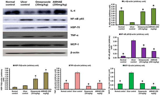 Immunoblotting results confirmed that the ethanol-induced ulcer control group exhibited significant reductions in IL-4 (5.96-fold) level and increases of NF-κB p65 (10.50-fold), TNF-α (2.66-fold), and MCP-1 (3.06-fold) levels compared to the normal group. However, AMHAE pretreatment displayed significant increases of IL-4 (6.92-fold) and HSP-70 (4.57-fold) levels and a decline of NF-κB p65 (2.62-fold), TNF-α (2.66-fold), and MCP-1 (6.63-fold) levels compared to the ethanol-induced ulcer control group (Figure 9).