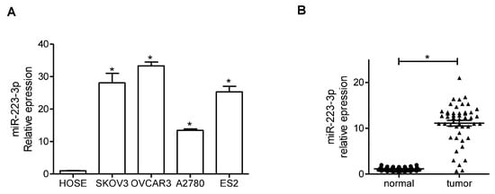 2.1. miR-223-3p Was Upregulated in (Ovarian Cancer) OC Cell Lines and Tissue Specimens