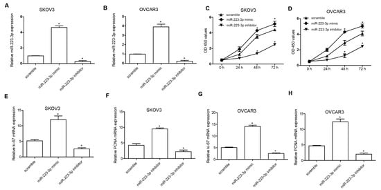 miR-223-3p regulated OC cell proliferation. (A,B) SKOV3 and OVCAR3 cells were transfected with 50 nM miR-223-3p mimic, inhibitor, or scramble for 24 h, respectively. Then, qRT-PCR analysis was performed. Relative miR-223-3p was shown; (C,D) SKOV3 and OVCAR3 cells were transfected with 50 nM miR-223-3p mimic, inhibitor, or scramble for 0, 24, 48, and 72 h. Cell viability was detected by CCK-8 assay; (E,G) SKOV3 cells were transfected with 50 nM miR-223-3p mimic, inhibitor, or scramble for 24 h. Relative Ki-67 mRNA expression was analyzed by qRT-PCR assay; (F,H) OVCAR3 cells were transfected with 50 nM miR-223-3p mimic, inhibitor, or scramble for 24 h. The relative proliferating cell nuclear antigen (PCNA) mRNA level was detected by qRT-PCR assay. * p < 0.05.