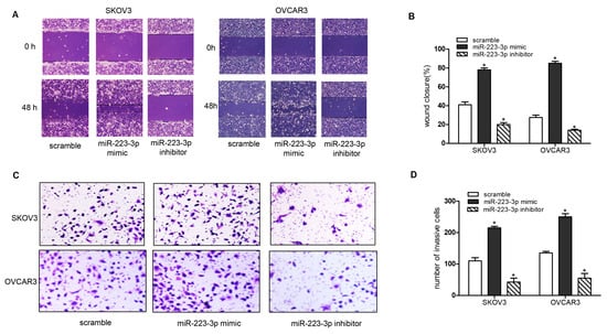 miR-223-3p regulated OC cell migration and invasion. (A) SKOV3 and OVCAR3 cells were transfected with 50 nM miR-223-3p mimic, inhibitor, or scramble for 48 h, respectively. Then, wound closure assay was performed. Original magnification: ×40. The wound closure rate is shown in (B); (C) SKOV3 and OVCAR3 cells were transfected with 50 nM miR-223-3p mimic, inhibitor, or scramble for 48 h. Cell invasion was determined by invasion assay. Original magnification: ×100; (D) Invasive cells per field is shown. * p < 0.05.