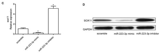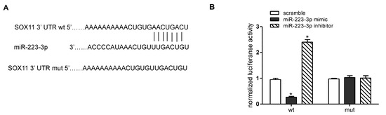 miR-223-3p targeted SOX11 in OV cells. (A) The 3′UTR of SOX11 mRNA contains binding sites of miR-223-3p; (B) Luciferase assay was used to confirm the direct regulation of miR-223-3p on SoX11 3′UTR; (C) SOX11 mRNA expression in SKOV3 cells transfected with miR-223-3p mimic, inhibitor, or scramble was detected by qRT-PCR; (D) Western blot was performed to detect the effects of miR-223-3p mimic, inhibitor, or scramble on the expression of SOX11. GAPDH was used as loading control. wt: wild type; mut: mutation; * p < 0.05.