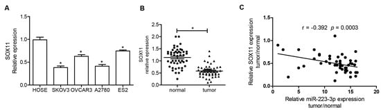 2.5. SOX11 Was Inversely Expressed with miR-223-3p in OC Cell Lines and Tissue Specimens