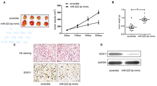 Overexpression of miR-223-3p increased tumor growth in SKOV3 xenografts. (A) Growth curves of tumor volumes in BABL/c nude mice after injection of SKOV3/miR-223-3p mimic or scramble; (B) Tumor weight was measured in each group after necropsy; (C) An immunohistochemistry assay was performed to detect SOX11 protein expression in tumor tissue. HE, Hematoxylin-Eosin; Original magnification: ×100; (D) SOX11 was determined by western blot analysis. GAPDH was used as control. * p < 0.05.