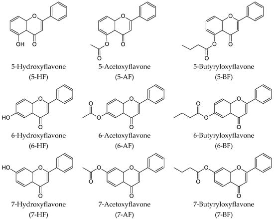 Chemical structures of the tested flavones. HF, Hydroxyflavone; AF, Acetoxyflavone; BF, Butyryloxyflavone.
