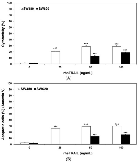 Cytotoxic and apoptotic effects of rhsTRAIL on SW480 and SW620 colon cancer cells. Cells were incubated with 25–100 ng/mL TRAIL for 48 h. The values represent the mean ± SD of three independent experiments (n = 3). (A) Cytotoxic activity of rhsTRAIL against colon cancer cells. The percentage of cell death was measured using the MTT cytotoxicity assay (*** p < 0.001 compared to control without rhsTRAIL); (B) Apoptotic activity of rhsTRAIL against colon cancer cells. Apoptotic cell death was detected by flow cytometry using annexin V-FITC staining (*** p < 0.001 compared to control without rhsTRAIL).