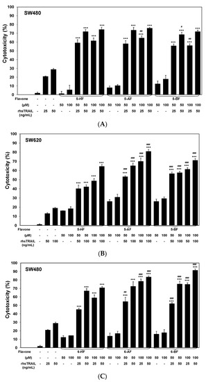 Cytotoxicity was determined by the 3-(4,5-dimethylthiazol-2-yl)-2,5-diphenyltetrazolium bromide (MTT) assay as previously described [50,65,66]. SW480 cells (5 × 105/mL) and SW620 cells (2.5 × 105/mL) were seeded 24 h before the experiments in a 96-well plate. Flavones (50–100 μM dissolved in DMF) and/or TRAIL (25–200 ng/mL) were added to the cells for 48 h. After incubation, the medium was removed, and 20 μL MTT solution prepared at 5 mg/mL (Sigma Chemical Company) were added to each well for 4 h. The resulting crystals were dissolved in DMSO. Controls included native cells and medium alone. The spectrophotometric absorbance of each well was measured using a microplate reader (EonTM Microplate Spectrophotometer, BioTek, Winooski, VT, USA) at 550 nm. The percent cytotoxicity was calculated using the formula: percent cytotoxicity (cell death) = [1 − (absorbance of experimental wells/absorbance of control wells)] × 100%.