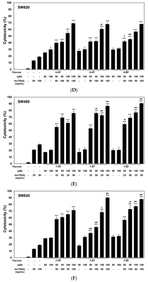 Cytotoxic effect of rhsTRAIL in combination with flavones on SW480 and SW620 colon cancer cells. Cells were incubated with rhsTRAIL at concentrations of 25–100 ng/mL and/or the compounds at 50 μM and 100 μM for 48 h. The values represent the mean ± SD of three independent experiments (n = 3). The percentage of cell death was measured using the MTT cytotoxicity assay (*** p < 0.001 compared to rhsTRAIL, # p < 0.05, ## p < 0.01 and ### p < 0.001 compared to rhsTRAIL + substrate: 5-HF or 6-HF or 7-HF). Cytotoxic activity of rhsTRAIL with flavones: (A) 5-HF, 5-AF or 5-BF against SW480 cells; (B) 5-HF, 5-AF or 5-BF against SW620 cells; (C) 6-HF, 6-AF or 6-BF against SW480 cells; (D) 6-HF, 6-AF or 6-BF against SW620 cells; (E) 7-HF, 7-AF or 7-BF against SW480; and (F) 7-HF, 7-AF or 7-BF against SW620 cells.