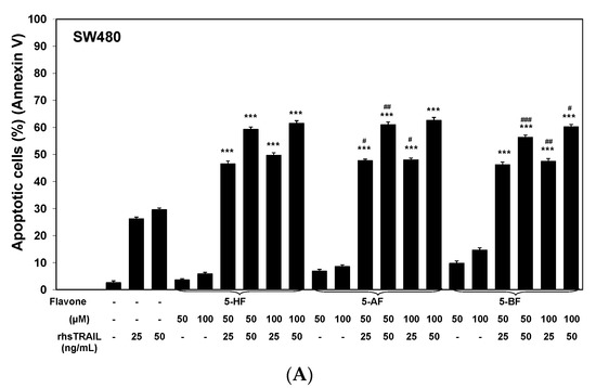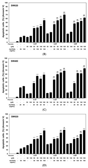 The flavone derivatives with an acetyl or a butyryl group at position 5 (5-AF, 5-BF), at position 6 (6-AF, 6-BF) or at position 7 (7-AF, 7-BF) in combination with rhsTRAIL exhibited a significant higher apoptotic effect against SW480 and SW620 cells compared to their substrates (5-HF, 6-HF, 7-HF).