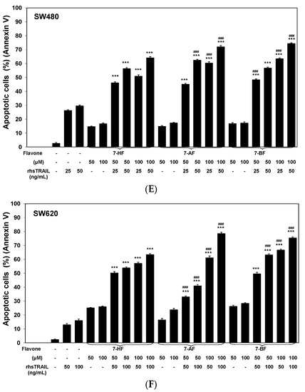 Apoptotic effect of rhsTRAIL in combination with flavones on SW480 and SW620 colon cancer cells. Cells were incubated with rhsTRAIL at concentrations of 25–100 ng/mL and/or the compounds at concentrations of 50 μM and 100 μM for 48 h. The values represent the mean ± SD of three independent experiments performed in duplicate (n = 6). Apoptotic cell death was detected by flow cytometry using annexin V-FITC staining (*** p < 0.001 compared to rhsTRAIL, # p < 0.05, ## p < 0.01 and ### p < 0.001 compared to rhsTRAIL + substrate). Apoptotic activity of rhsTRAIL with flavones: (A) 5-HF, 5-AF or 5-BF against SW480 cells; (B) 5-HF, 5-AF or 5-BF against SW620 cells; (C) 6-HF, 6-AF or 6-BF against SW480 cell; (D) 6-HF, 6-AF or 6-BF against SW620 cells; (E) 7-HF, 7-AF or 7-BF against SW480; and (F) 7-HF, 7-AF or 7-BF against SW620 cells.