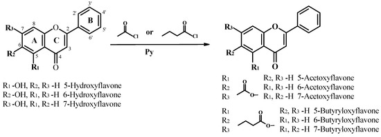 Synthesis of 5-acetoxyflavone, 6-acetoxyflavone, 7-acetoxyflavone and 5-butyryloxyflavone, 6-butyryloxyflavone, 7-butyryloxyflavone.