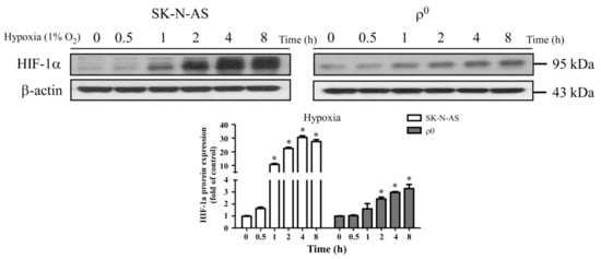 Hypoxia induced factor 1α (HIF-1α) was activated in hypoxic SK-N-AS and ρ0 cells. The upper panel shows HIF-1α protein expression with immunoblotting after different hypoxic times in SK-N-AS and ρ0 cells; the bar chart below illustrates HIF-1α protein expression change with different hypoxic times (relative quantification to β-actin). Data are shown as mean ± SD of three independent experiments. * Represented p < 0.05 when compared to normoxic condition was determined using one-way ANOVA.