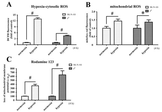 Hypoxia and mitochondrial DNA (mtDNA) affect the production of ROS and loss of mitochondrial membrane potential (Δψm). Intracellular H2O2 production (A); or mitochondrial superoxide (B) under normoxia or after hypoxia for 4 h were determined by flow cytometry with DCFH-DA or MitoSox red individually in both SK-N-AS and ρ0 cells; (C) Loss of mitochondrial membrane potential in normoxic or hypoxic SK-N-AS and ρ0 cells were measured by Rodamine 123. The percentages loss of Δψm indicated the number of Δψm collapsed cells after exposure to hypoxia. These results are shown as mean ± SD of more than three independent experiments. Statistical significance (* p < 0.05, # p < 0.005) was determined using the one-way ANOVA compared to normoxia.