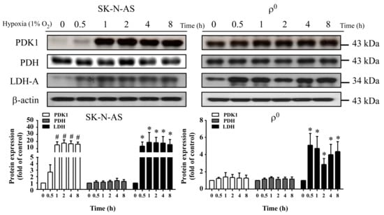 Effect of hypoxia on metabolism-related proteins in SK-N-AS and 2137 ρ0 cells. Upper panel shows immunoblotting of the expression of pyruvate dehydrogenase kinase 1 (PDK1), pyruvate dehydrogenase (PDH) and lactate dehydrogenase A (LDH-A) proteins after different hypoxic times; the bar chart in lower panel shows the relative changes (to β-actin) of PDK1, PDH and LDH-A proteins. The results are shown as mean ± SD of more than three separate experiments in which similar results were obtained. * Represented p < 0.05 and # represented p < 0.005 when compared to normoxic condition were determined using the one-way ANOVA.