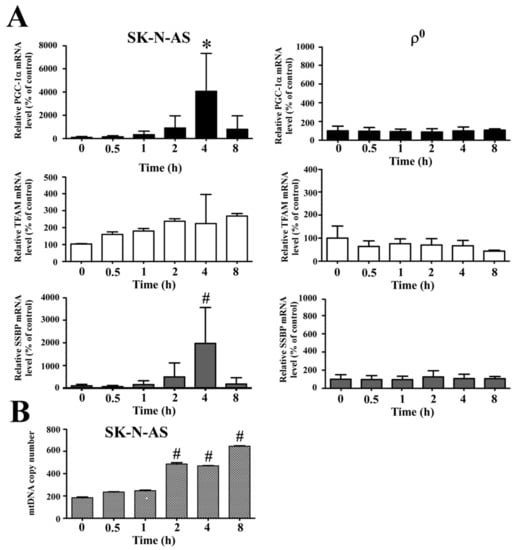 The human neuroblastoma cells (SK-N-AS, American Type Culture Collection, Manassas, VA, USA) were cultured with Dulbecco’s modified Eagle’s medium (DMEM) containing 10% (v/v) heat-inactivated fetal bovine serum (FBS; Invitrogen, Carlsbad, CA, USA), and antibiotic-antimycotic (Invitrogen) in 5% CO2/95% O2 humidified incubator at 37 °C. The cells were isolated and then re-cultured at a 1:10 ratio when the cells grew to 60–80% of confluence and maintained in DMEM containing 10% FBS, 25 mM HEPES, 110 mg/mL pyruvate and 50 ng/mL uridine (Invitrogen, Carlsbad, CA, USA) in 5% CO2/95% O2 humidified incubator at 37 °C. Furthermore, cells grew in a medium with 50 ng/mL ethidium bromide (EtBr) for 3 months to deplete mtDNA. A single clone was selected by limit dilution. The mtDNA-depleted ρ0 cells were confirmed by detection of mtDNA copy number, expression of mtDNA-coded proteins and oxygen consumption in the absence of EtBr [,]. The ρ0 cells were subcultured at a 1:3 ratio when the cells grew to 60–80% of confluence.