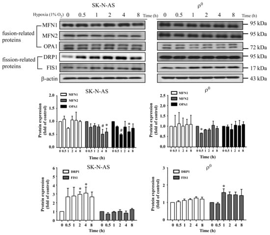 The effect of hypoxia on mitochondrial dynamic related proteins. The representative Western blot and the quantification analysis of mitofusin 1 (MFN1), mitofusin 2 (MFN2), optic atrophy factor 1 (OPA1), dynamin-related protein 1 (DRP1) and human fission factor-1 (FIS1) were determined in SK-N-AS (left panel) or ρ0 (right panel) cells after different hypoxic times exposure. Data are shown as mean ± SD of three separate experiments. * Represented p < 0.05 and # represented p < 0.005 when compared to 21% O2 baseline were determined using the one-way ANOVA.