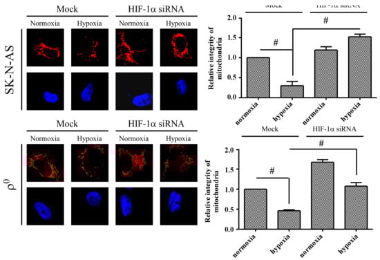 The effect of hypoxia and HIF-1α on mitochondrial morphology. After transfecting with 20 nM non-targeting siRNA (Mock) or HIF-1α siRNA (right panel) for 24 h, neuroblastoma cells were further treated with 4 h of hypoxic condition. Morphology of mitochondria in neuroblastoma cells were stained with MitoSOX Red (0.5 µg) and nuclei were stained with DAPI showing blue fluorescent. Graphs show the relative integrity area of mitochondria by using wand tool function of software ImageJ. Data are shown as mean ± SD of three separate experiments. # Represented p < 0.005 when compared to normoxic Mock condition was determined using the t-Test.