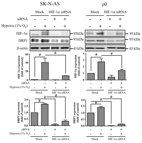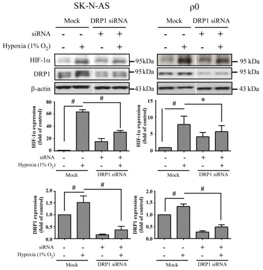 SK-N-AS and ρ0 cell were seeding in triplicate at a density of 5 × 105 cells per well in 6-cm dish. Cells were transfected with non-targeting siRNA (Santa Cruz, CA, USA), DRP1 siRNA (10 nM) (Santa Cruz, CA, USA) and HIF-1α siRNA (20 nM) (Santa Cruz, CA, USA) in 50 µL of Opti-MEM medium after overnight incubation. Then, 8 µL of RNAiMAX (Invitrogen) was gently mixed with 150 µL of Opti-MEM medium and incubated for 5 min at room temperature. After the 5 min incubation, the diluted DNA with the diluted RNAiMAX was combined and incubated for another 30 min at room temperature to allow the siRNA-RNAiMAX mix (Invitrogen) complexes to form. The 100 µL siRNA-RNAiMAX mixtures of each well were mixed gently by rocking the plate and incubated at 37 °C in a CO2 incubator for 24 h and then change to 10% FBS medium. Following an overnight incubation, the cells were treated with and without hypoxia for 4 h.