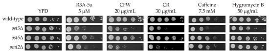Our previous work indicated that O-mannosylation and N-glycosylation are interconnected at various levels [,,,]. Here, we identified mutants of two subunits of the OST complex, Wbp1 and Ost3, which displayed a negative growth phenotype when O-mannosylation was impaired (Table 1). Ost3 and its homolog Ost6 are alternatively present in the OST complex influencing its substrate specificity []. To verify the different sensitivities of ost3Δ and ost6Δ strains towards the PMT-inhibitor, we performed spotting assays (Figure 2). In the presence of 5 μM R3A-5a on solid media, the deletion of OST6 resulted only in mild sensitivity to the drug when compared to the wild-type, while the growth of the ost3Δ strain was as severely impaired, as the growth of pmt2Δ cells. Similar performance was observed in the presence of agents known to decrease the growth of mutants with cell wall defects [,,] (Figure 2). Interestingly, in the case of agents directly targeting cell wall glycans (Congo red and calcofluor white []), the growth of the ost3Δ mutant was impaired to the same extent as the growth of pmt2Δ cells.