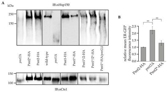Pmt2 acts in a complex with Pmt1 which is also N-glycosylated (Figure 3). To elucidate whether the absence of N-glycans of both complex partners has a more pronounced effect on the complex activity, we analyzed the O-mannosylation status of Cts1 and Hsp150 from cells expressing non-glycosylated Pmt1 (Pmt1*-HA) in combination with wild-type or non-glycosylated Pmt2. Again, no significant differences of the O-mannosylation status of the substrate proteins were observed when compared to wild-type conditions (Figure 4A).